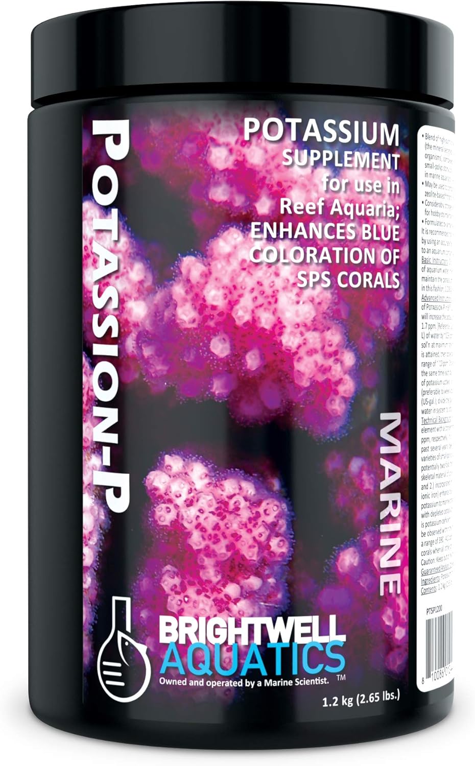 Doğal deniz suyunda potasyum, kalsiyumdan biraz daha düşük bir konsantrasyona sahip (sırasıyla ~399 ppm’ye karşı ~413 ppm) muhafazakar olmayan bir ana elementtir. Aragonitin bir bileşenidir ve düzenli dozajlamanın, son birkaç yıldır, çok sayıda küçük polipli taş mercanın mavi rengini iyileştirmede rol oynadığı gösterilmiştir; potasyum takviyesinin faydaları potansiyel olarak iki yönlüdür, o zaman: 1.) büyüme amacıyla mercanların ve diğer resif oluşturan organizmaların iskelet malzemesine dahil edilen ve 2.) küçük polipli taş mercanların mavi rengini artıran (muhtemelen yeterli iyonik demir varlığında) pigmentlere dahil edilen bir elementin sağlanması. Potasyumun deniz organizmaları için önemi, potasyum konsantrasyonları tükenmiş akvaryumlarda ve/veya kullanılan deniz tuzu karışımının potasyum eksikliği olduğu durumlarda dozlamaya başlandığında en belirgin hale gelir; bu gibi durumlarda, birçok mercanın görünümündeki değişiklikler düzenli dozajlamanın ilk haftalarında gözlemlenebilir. Potasyumun 390 – 410 ppm aralığında tutulması, diğer tüm fiziksel ve kimyasal gereksinimler karşılandığında mercanların uzun vadeli sağlığı, büyümesi ve renklenmesi için yeterlidir. Akvaryumdaki potasyum konsantrasyonunun, takviyeden önce doğru bir test kiti kullanılarak belirlenmesi önerilir. Bu ürünü, talimatlara göre suda seyreltmeden doğrudan canlı hayvanların bulunduğu bir akvaryuma eklemeyin.